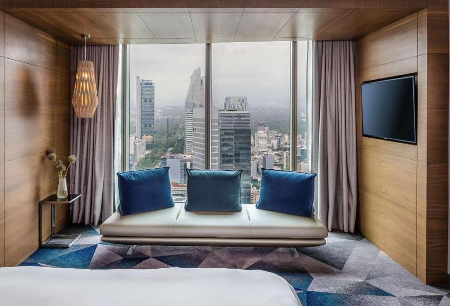 Ein hoch aufragendes Hochhaus am Paseo de la Reforma, das einen Panoramablick auf die Stadt bietet. Die Inneneinrichtung verbindet eleganten Modernismus mit warmen, organischen Akzenten - zum Beispiel gemusterte Teppiche, raumhohe Fenster und luxuriöse L'Occitane-Annehmlichkeiten. Freuen Sie sich auf ein Spa, einen beheizten Pool und ein Restaurant auf der Dachterrasse mit französisch-mexikanischem Einschlag.
