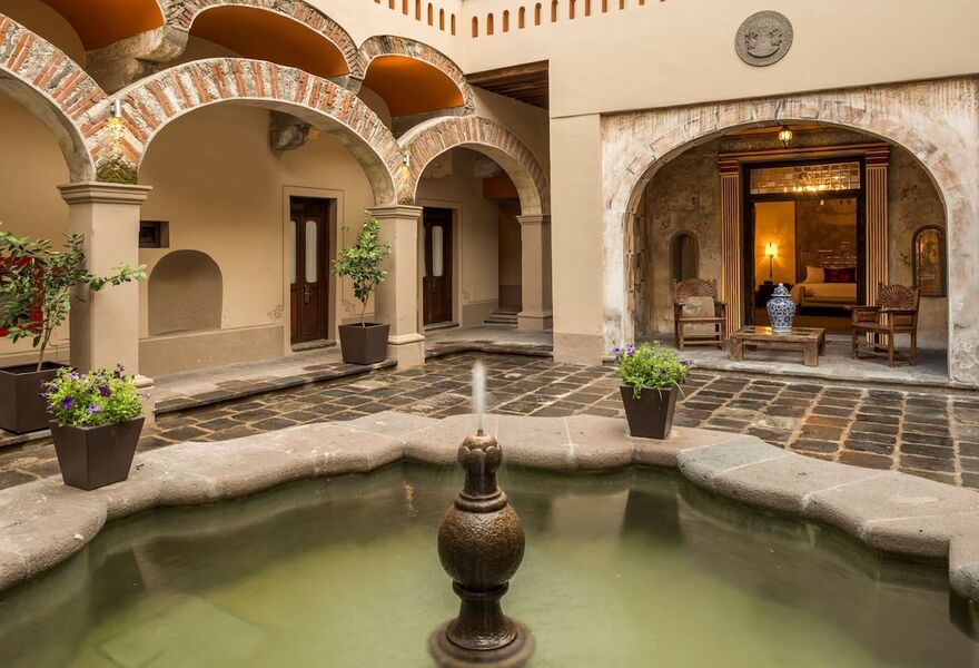 This historic hotel in Puebla blends colonial charm with modern comforts. The elegant decor features arches, fountains, and unique contemporary touches. Guests can enjoy gourmet dining, mezcal cocktails, a gym, and luxury services. Ideal for business and leisure, a blend of style and convenience.