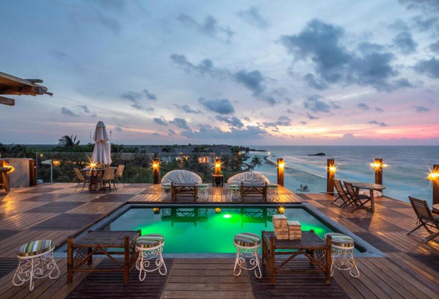 Set in Tulum, this elegant hotel blends modern comfort with a relaxed, tropical feel. Earthy tones and sleek design create a stylish yet laid-back atmosphere. Guests can enjoy a pool, hot tub, and a restaurant serving Mediterranean and Mexican flavours. A good choice for both luxury and ease.