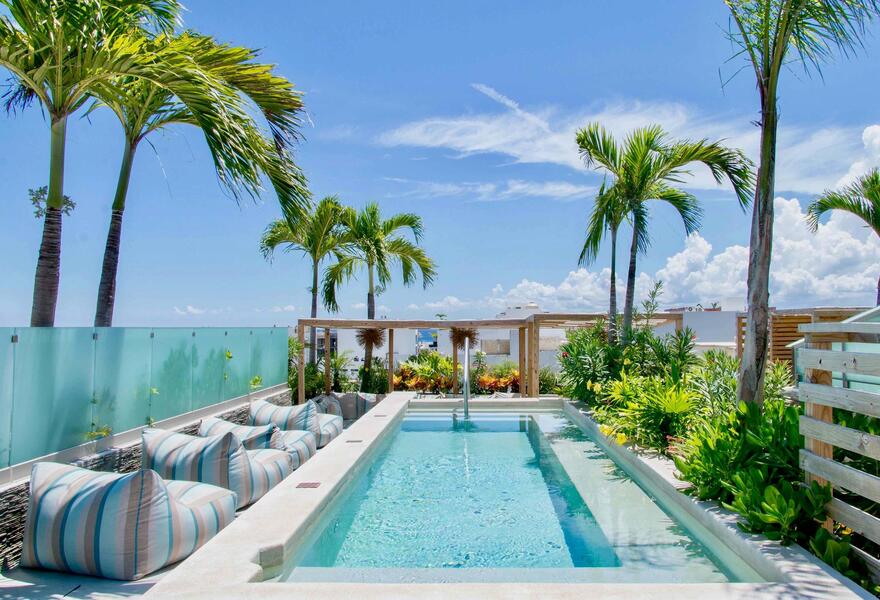 A stylish adults-only hotel set in a buzzy area of Playa del Carmen. Interiors are chic and contemporary; rooms are decorated in soft grey hues with clean lines, floor-to-ceiling windows, and modern art. However, it is the vibey rooftop with a pool, restaurant, and cocktail bar that steal the show.