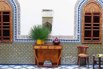 One of the most architecturally impressive this French run riad enjoys an excellent location in Fez medina. A marble floored entrance leads to intricately tiled rooms, decorated in rich fabrics and dark cedar wood furnishings. A healthy Moroccan breakfast is served as well as dinner by arrangement.