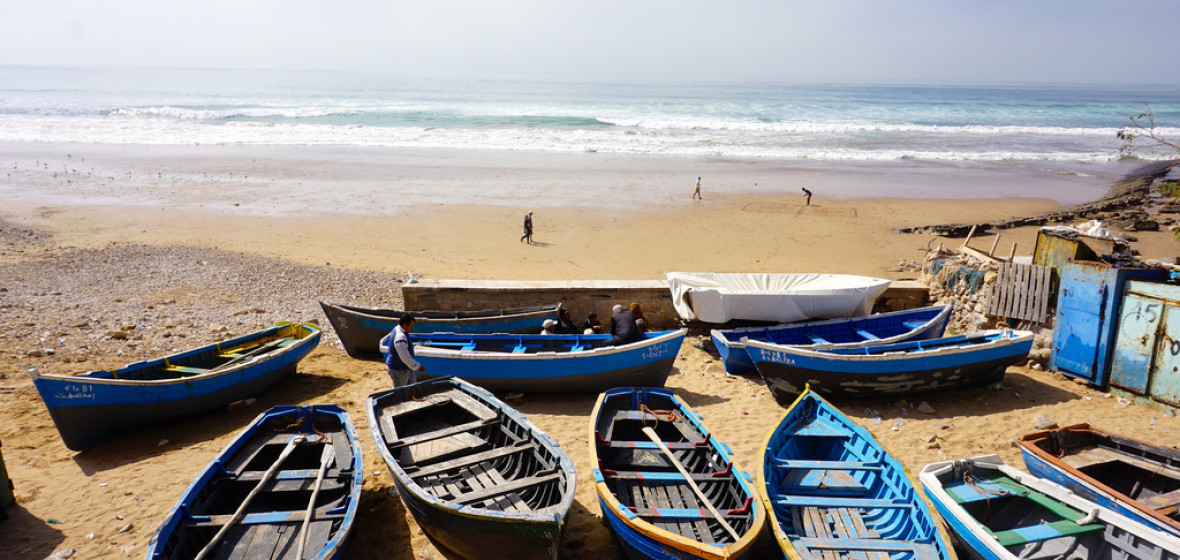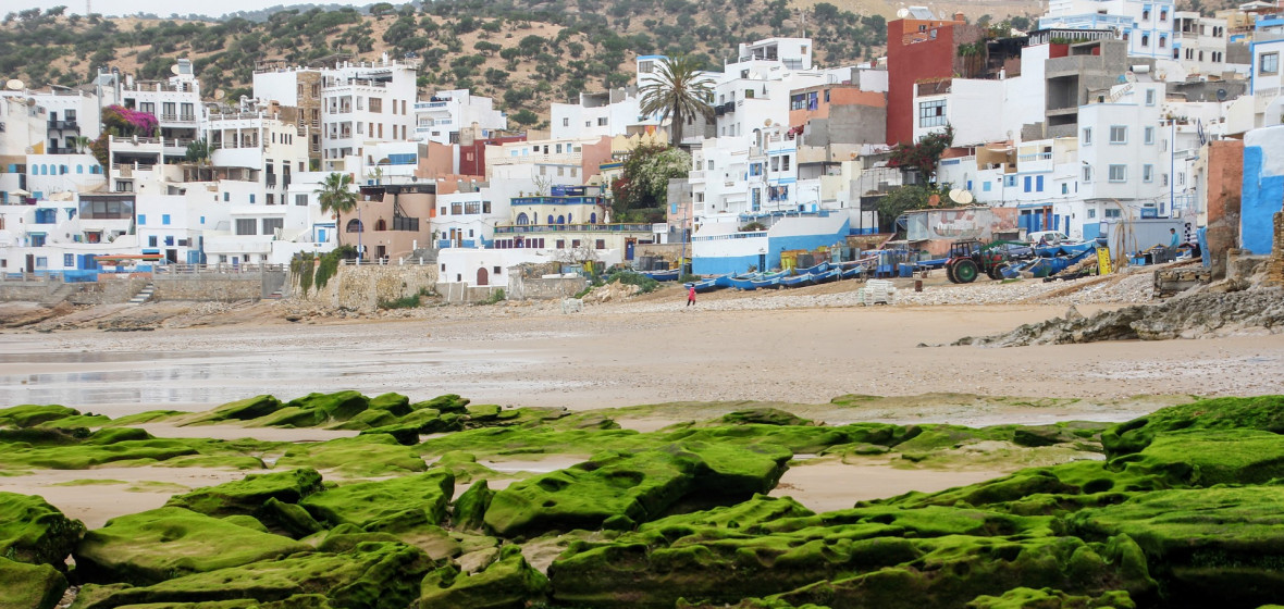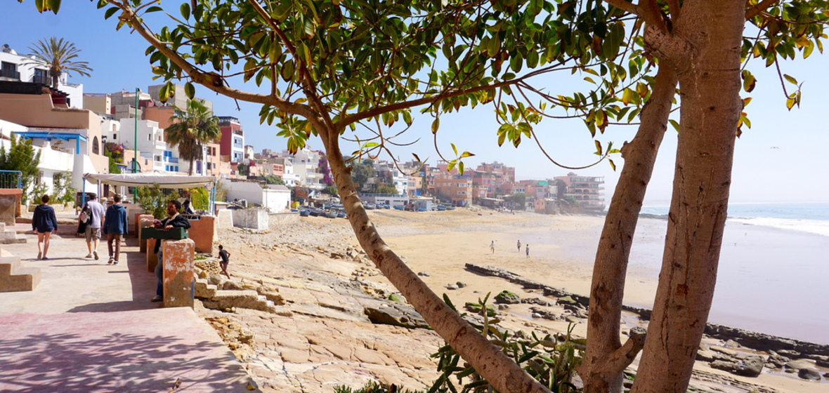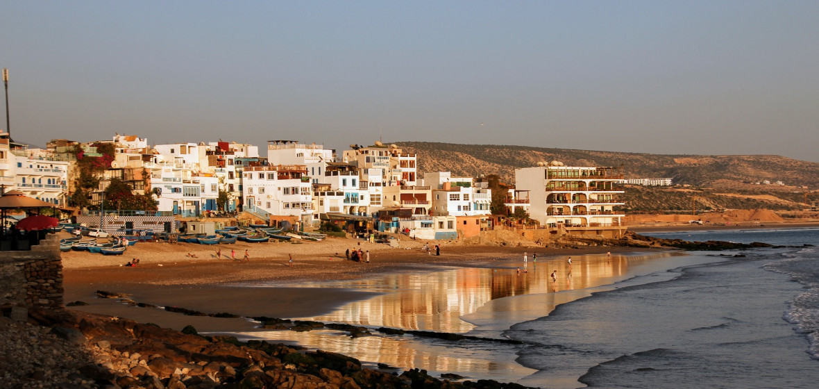 Surfer aus aller Welt kommen in Scharen in dieses schmuddelige Dorf an der Küste, nicht nur wegen der wilden, stürmischen Wellen des Atlantiks, sondern auch wegen der Stadt selbst, einer hübschen Ansammlung von weißen und blauen Häusern, die sich durch staubige Gassen schlängeln. Es herrscht eine bemerkenswert friedliche Atmosphäre. Sowohl in der Morgen- als auch in der Abenddämmerung kann man auf den Terrassen mit Blick auf das Meer regelmäßige Yogasitzungen beobachten. In Taghazout gibt es zahlreiche Surfschulen, die von Ex-Profis aus aller Welt geleitet werden und alle Niveaus abdecken, wobei einige der Surflehrer selbst als die Besten der Branche gelten.