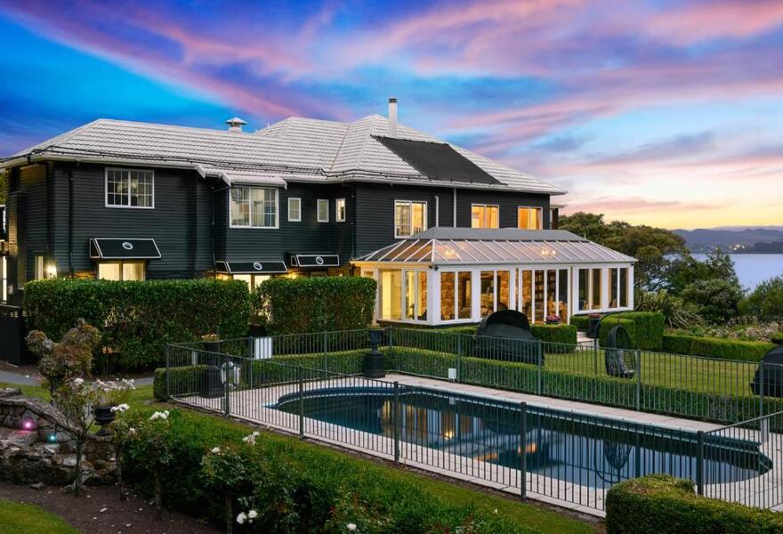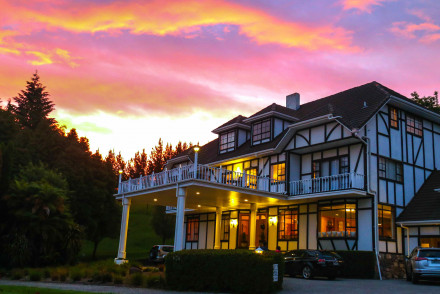 A half-timbered lodge with suites featuring striking New Zealand artwork and natural stone & wood finishes. Fantastic location in hills of Rotorua with views towards Lake Rotorua, a pool and tennis court. Impressive 15 acres of landscaped gardens.