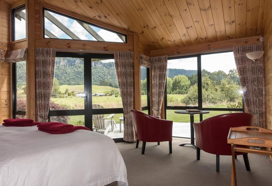A cosy lodge set in picturesque countryside just a short distance from Rotorua. Rooms feature wood-panelled walls, beamed ceilings, sink-into beds and sliding glass doors leading into the garden. The breakfasts are an indulgent affair and the hosts ever hospitable. A charming rural hideaway.