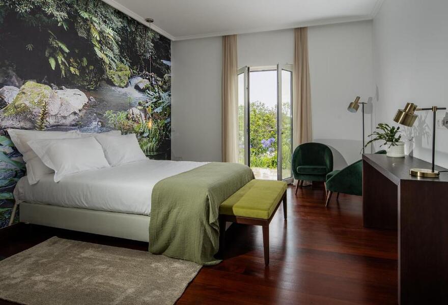 Tucked away in São Miguel, this farmhouse-turned-hideaway blends rustic charm with modern comforts. Interiors glow with antique furniture, soft textures, and a palette of calming greens. Expect a farm-to-table restaurant, rooftop pool, spa, and even a plunge pool in a pineapple greenhouse.