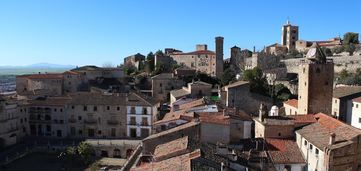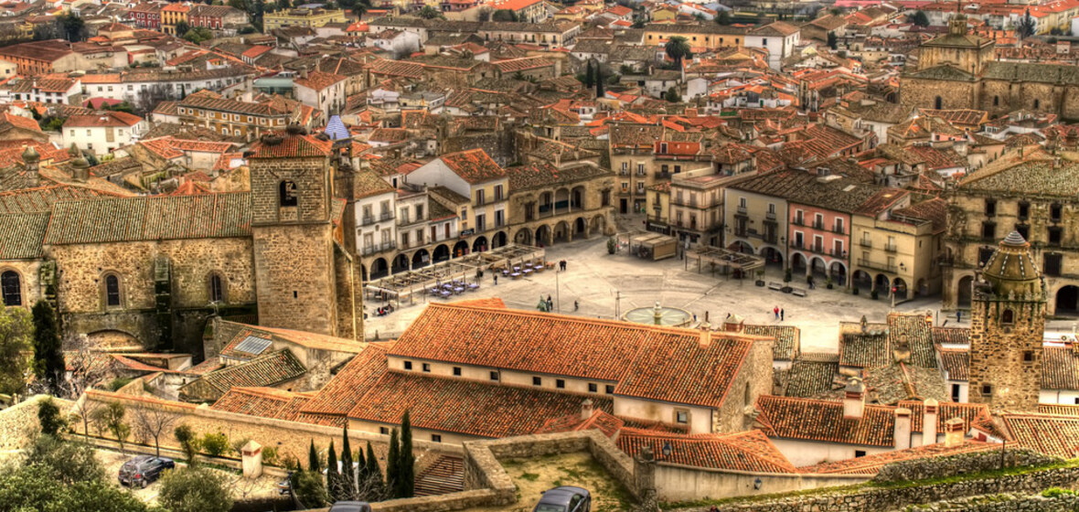Beginnen Sie Ihre Erkundungstour auf der Plaza Major von Trujillo, die von kunstvoll verzierten Renaissance- und Barockgebäuden gesäumt ist, von denen viele mit steinernen Türmchen und Kuppeln versehen sind. Die imposante Statue von Francisco Pizarro und der Palacio de la Conquista aus dem 16. Jahrhundert - erbaut für Pizarros Bruder und seine Tochter - sind Teil der Route der Konquistadoren und erinnern seit langem an die Verbindungen der Stadt zur Neuen Welt. Schlendern Sie durch die engen Gassen, besuchen Sie die Kunsthandwerksläden oder genießen Sie die Sonne in einem der lebhaften Cafés.