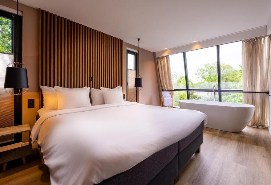 Ein Boutique-Refugium im Veluwezoom-Wald bei Arnheim. Das Design im Chalet-Stil kombiniert rohe Materialien mit sanften Akzenten für eine entspannte, gemütliche Atmosphäre. Frühstücken Sie im Bakhuis, genießen Sie Wein aus der Bar, und die Wanderwege liegen direkt vor Ihrer Tür. Fühlt sich eher an wie der Aufenthalt bei einem (sehr stilvollen) Freund.