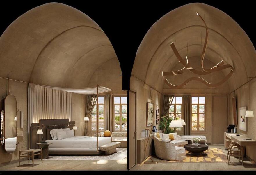 Carved into the rocky heart of Ortahisar, this cave retreat blends ancient charm with modern luxury. Interiors pair rugged stone walls with plush designer furnishings, antique chests, and Romanesque arches. Expect a rooftop terrace, Turkish dining, a spa, and stunning views.