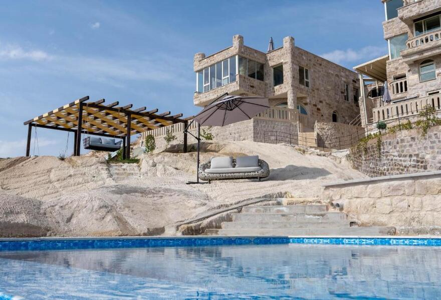 This adults-only hotel in Urgup blends unique cave living with modern luxury. The rooms, carved from natural stone, evoke an earthy, ancient charm. Guests can unwind with a hot tub, enjoy fresh local breakfasts, or sip drinks by the outdoor fireplace. An immersive, relaxing escape.