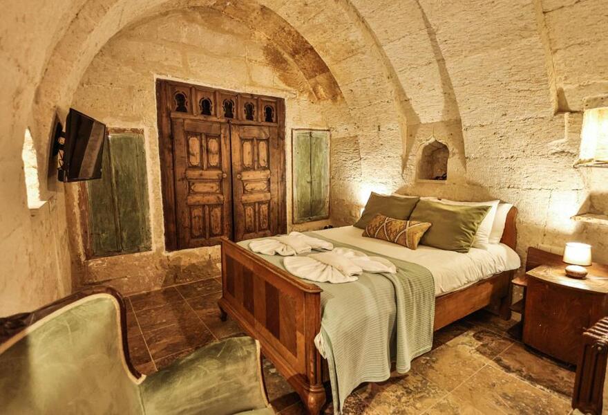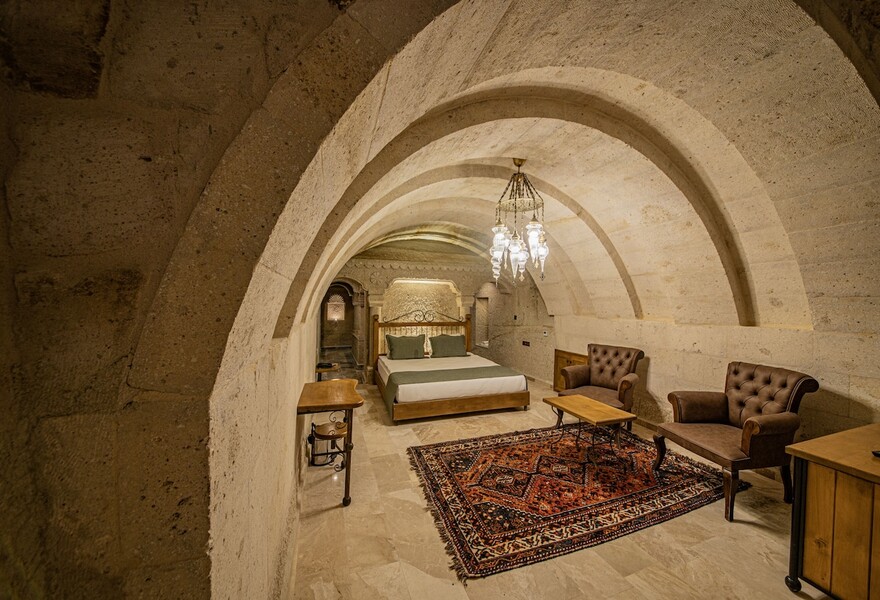 A restored Ottoman madrasah blending history with Cappadocia’s surreal charm, in the heart of Ürgüp. Arched stone walls, vaulted ceilings and carved rock suites lend an atmospheric, old-world elegance. Expect hearty breakfasts, rooftop views, and a warm Turkish welcome. A character stay with soul.