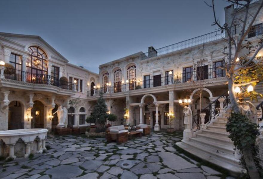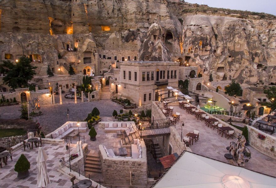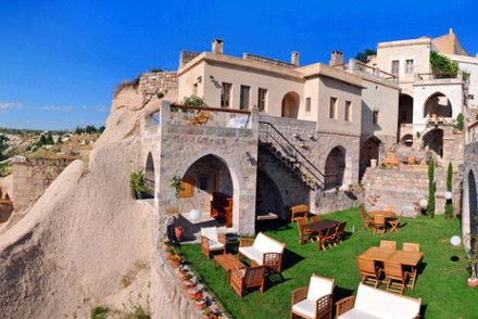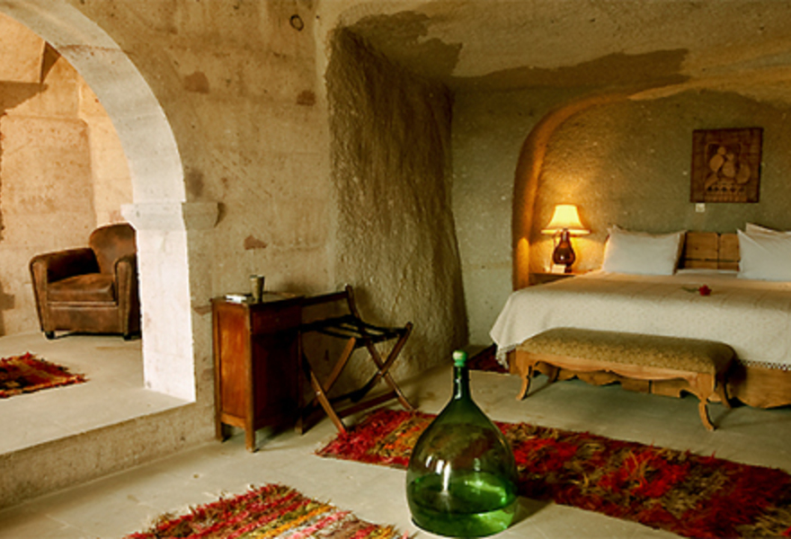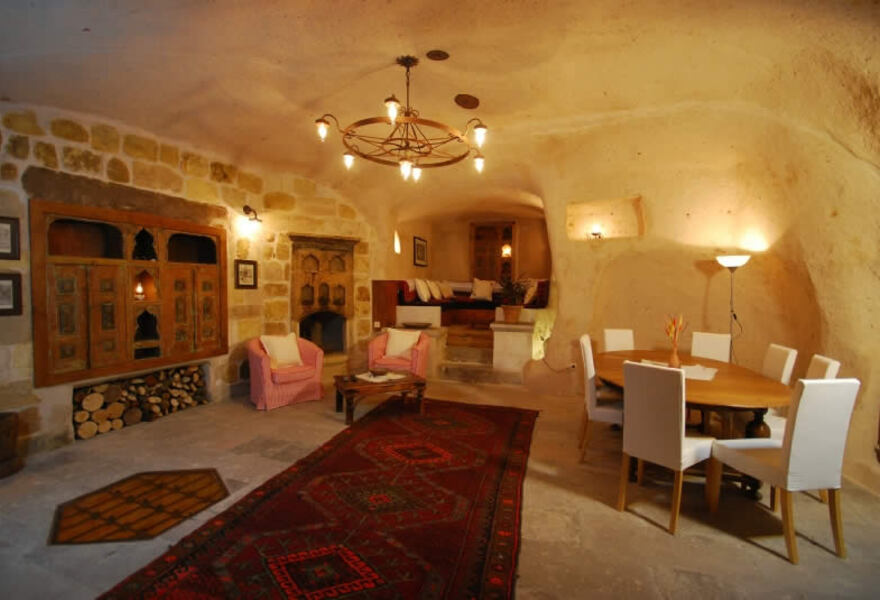 A stunning and unique hotel comprising of restored historical caves carved into soft stone cliffs of Kayakapi neighborhood, in Göreme National Park. Rooms highly luxurious with white-washed walls, antique furnishings and fireplaces. With Turkish baths, a gym, an outdoor swimming pool and restaurant.