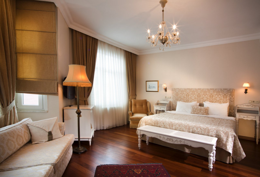 • The Hotel Sari Konak is an elegant Sultanahmet base, with incredible views of the Maramara Sea, the city, and especially of the Blue Mosque, which you can enjoy from the roof terrace. There are 23 rooms and suites, with large family suites that accommodate up to four people, and offer the hotel’s best views. The rooms have wood floors, cream furnishings and Turkish artefacts.