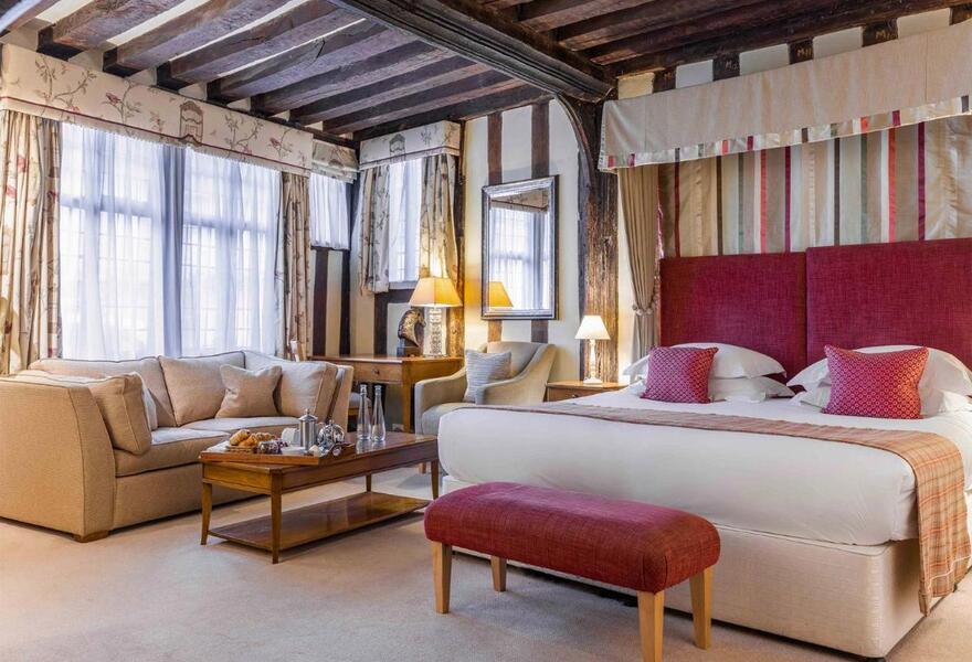 A 15th-century timber-framed coaching inn set in the medieval town of Lavenham. Characterful rooms keep their original features with exposed beams, wonky walls, antiques, and traditional fabrics. With fine dining and a spa, this is a luxurious base ideal for a romantic getaway.