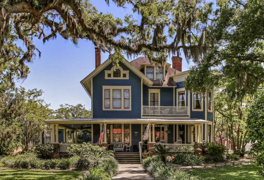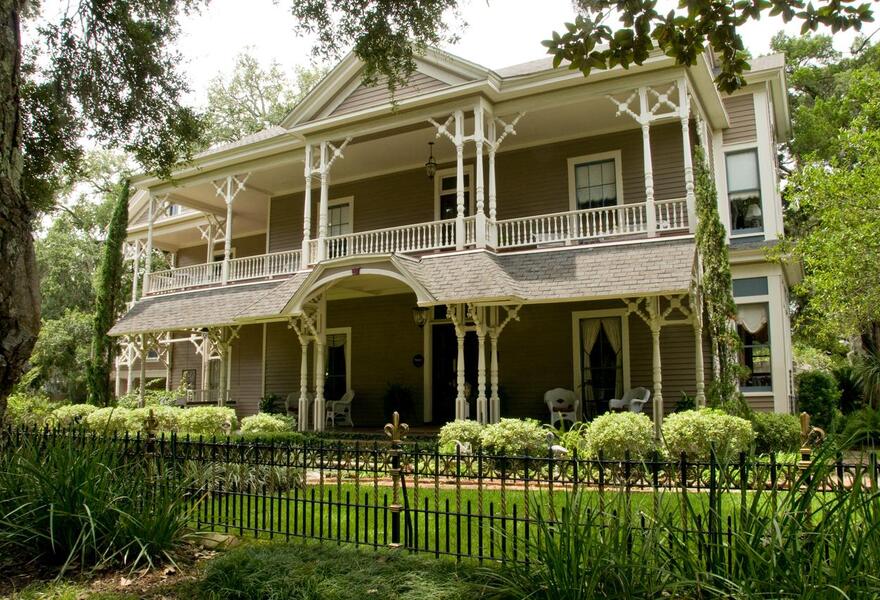 Romantic B&B dripping in Southern charm. Shaded by oaks trees, historic gingerbread mansion features a garden, quaint dining room, wide verandas and porch swings. Victorian-inspired rooms boast antique furnishings, chandeliers, ceiling fans and mahogany floors; some have hot tubs and private patios.