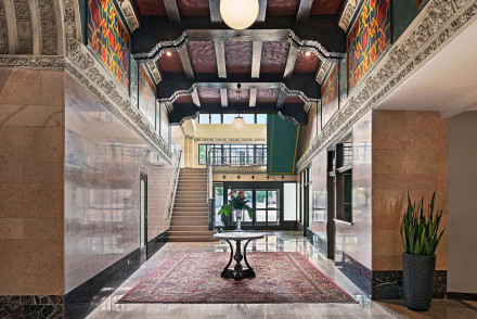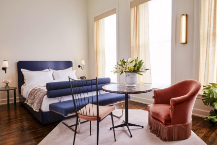 Cet élégant hôtel de charme est niché dans un bâtiment historique du centre-ville de Détroit. Les chambres présentent un mélange de meubles faits sur mesure et de pièces vintage sélectionnées à la main dans une palette de bleu royal et de roses sombres, que l'on retrouve dans la tapisserie en velours du Candy Bar, un espace intime de l'hôtel.