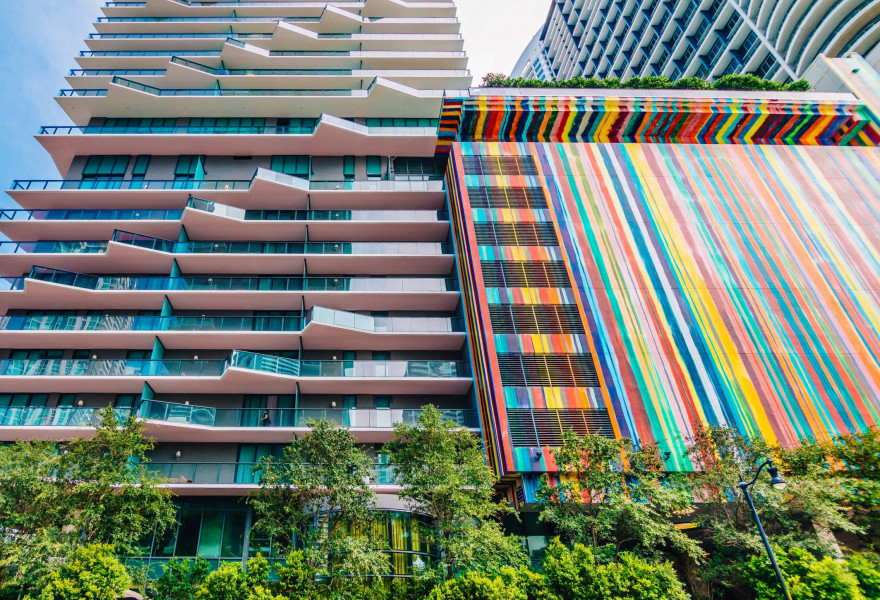 Modern skyscraper housing contemporary apartments two blocks from the water. Multi-room units with home-style decor have spacious living areas, well-equipped kitchens, laundry, balconies and impressive views. Live like a well-heeled local with fab on-site amenities including gym and rooftop pool.