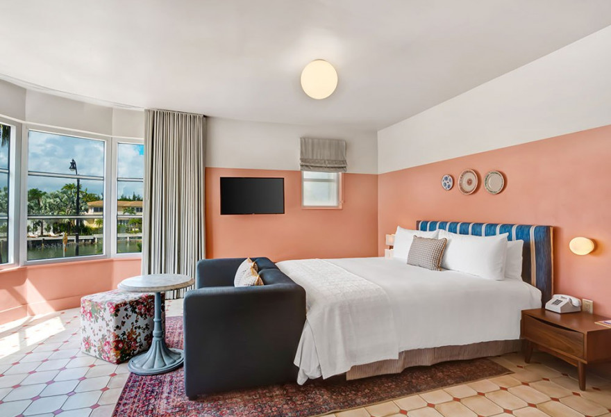Drawing inspiration from the neon lights of South Beach and the breathtaking Atlantic sunsets, bright patterns in defiantly saturated hues and custom-designed motifs adorn the interiors of this property. Rooms are welcoming and simple, and the rooftop pool and bar is a haven for open-air relaxation.