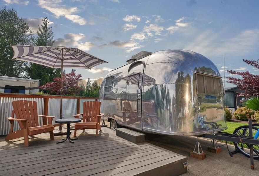 A cool trailer park offering a retro glamping experience near McMinnville in Willamette Valley wine country. Fully-restored Airstreams in twenty three unique styles, some with outdoor soaking tubs. Plus there's cruiser bikes to borrow, a pool, fire pits and on-site store. Full of vintage charm.