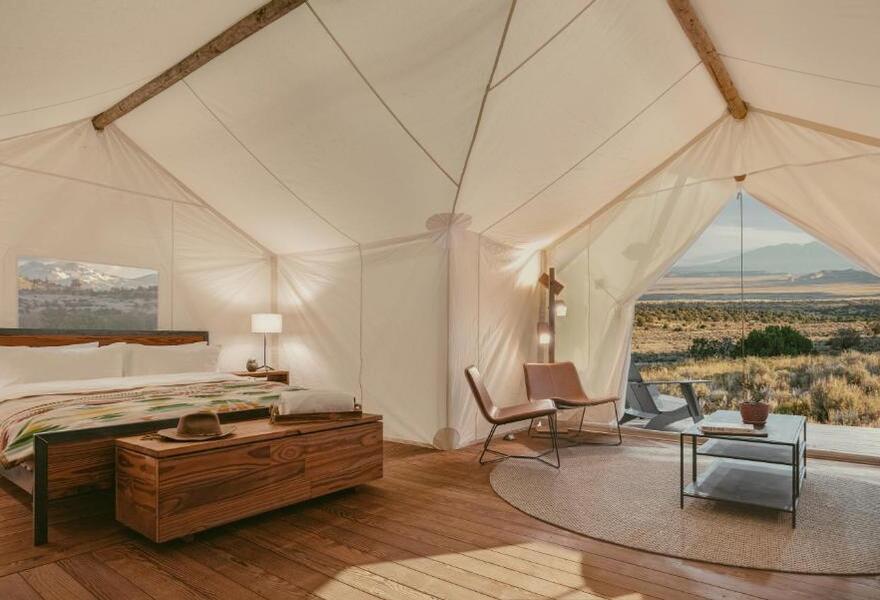 An upscale glamping stay amid Moab's red-rock splendour, blending natural wonders with refined luxury. Safari-inspired tents are adorned with West Elm furnishings and luxury linens. Plus you can expect full-service dining and dipping pools. A perfect fusion of adventure & comfort in Canyonlands.