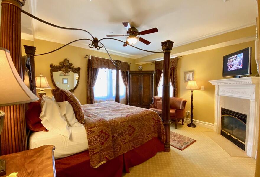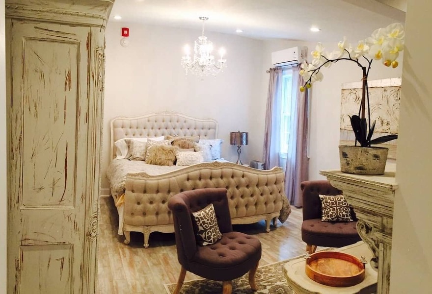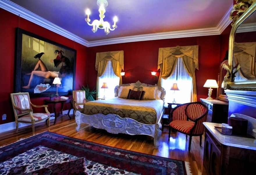 Romantisches B&B in einem ehemaligen viktorianischen Haus. Das opulente Dekor aus dem 19. Jahrhundert wurde zeitgemäß mit Möbeln im Renaissance-Stil, antiken Wandschränken, Wandverkleidungen, Plüschteppichen und eleganten Marmorbädern kombiniert. Genießen Sie den Nachmittagstee auf der Veranda. Glänzender historischer Charme mit modernen Annehmlichkeiten.