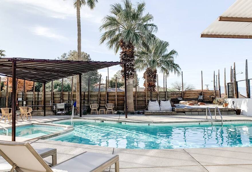 Mountain-view desert retreat with focus on well-being. Alternative boutique property located close to healing natural mineral hot springs. Hippy-chic rooms combine a fresh white palette with Native Indian prints and ethnic rugs. Enjoy outdoor pool, hot tub, Moroccan-style sun deck, spa & yoga area.