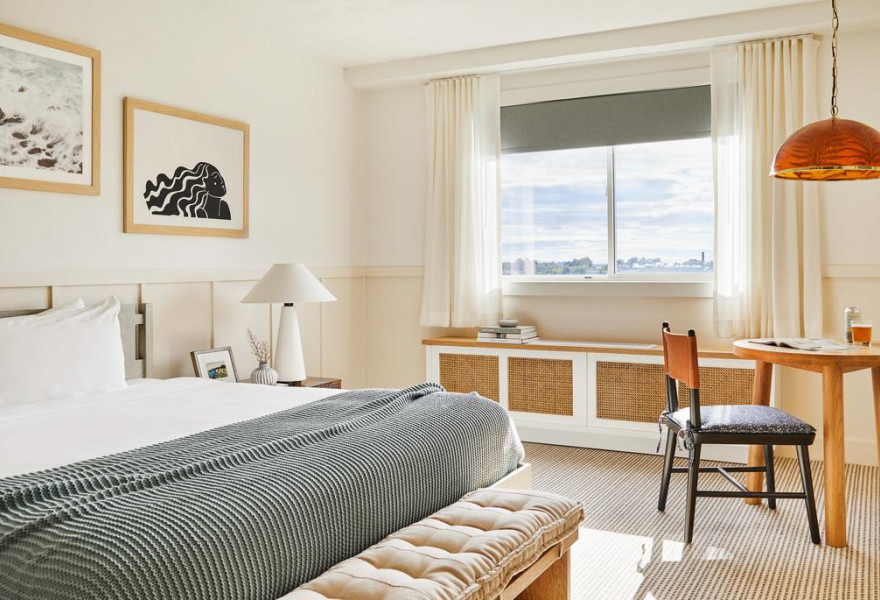 A coastal hotel nestled in the heart of Newport offering a mix of rooms and suites so guests can create their own bespoke configuration. Interiors are fresh and modern with seaside tones. Some rooms offer a kitchen, plus there's a firepit and covered terrace. A great choice for group getaways.