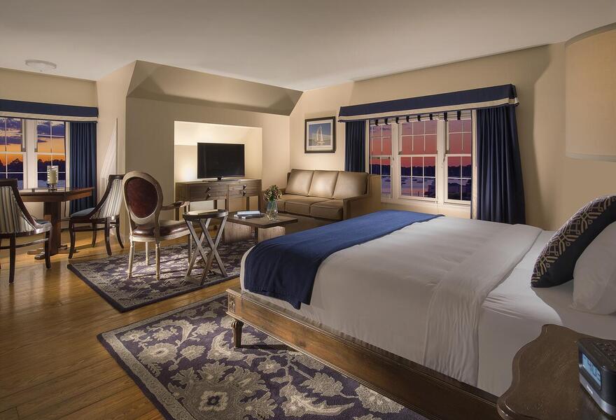 A beautiful, luxury resort located on the historic Goat Island, just minutes from downtown Newport. Rooms are modern with lots of natural light and hints of blue and spacious bathrooms with walk-in showers. Relax at the Regent Lounge by the firepit and enjoy delicious Italian fare at Scarpetta.
