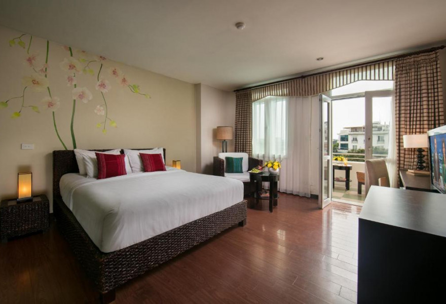 A luxury property in Hanoi's Old Quarter. Hip contemporary design runs throughout. Dramatic paintings reside above the bed that features an impossibly thick mattress. Dark pink furniture brings splashes of colour. An elegant bar and classic Vietnamese restaurant. One of Hanoi's finest.