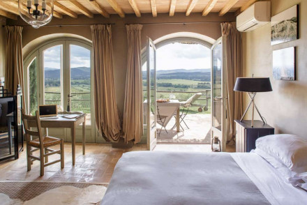 A stunning country house surrounded by its own vines and parkland. A hilltop position with fantastic valley views. Sumptuous elegant rooms and suites with lots of space and big bath tubs. Fantastic Mediterranean restaurant, billiards, tennis, wine tasting, swimming pool, and views for miles. Wow!