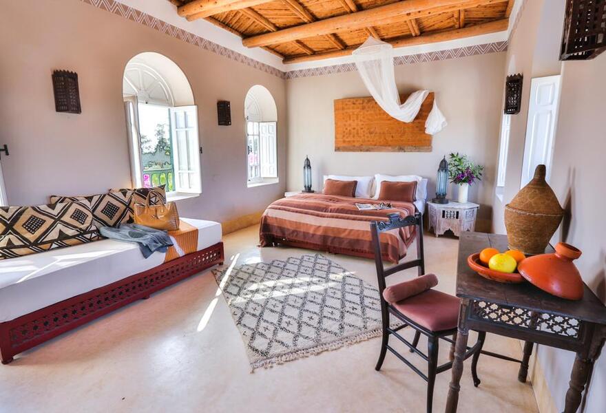 Traditionelles Berberhaus etwas außerhalb von Essaouira, umgeben von einer wunderschönen Landschaft. Sechs Zimmer und zwei Suiten sind im klassischen Stil mit geschnitzten Holzbetten und Fliesenböden eingerichtet. Es gibt einen schönen Pool zur Abkühlung und wunderbare marokkanische Abendessen, die aus den besten Zutaten des Marktes zubereitet werden.
