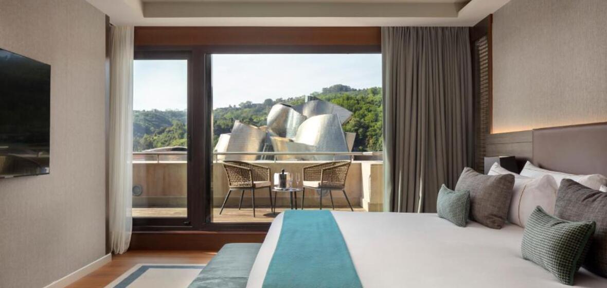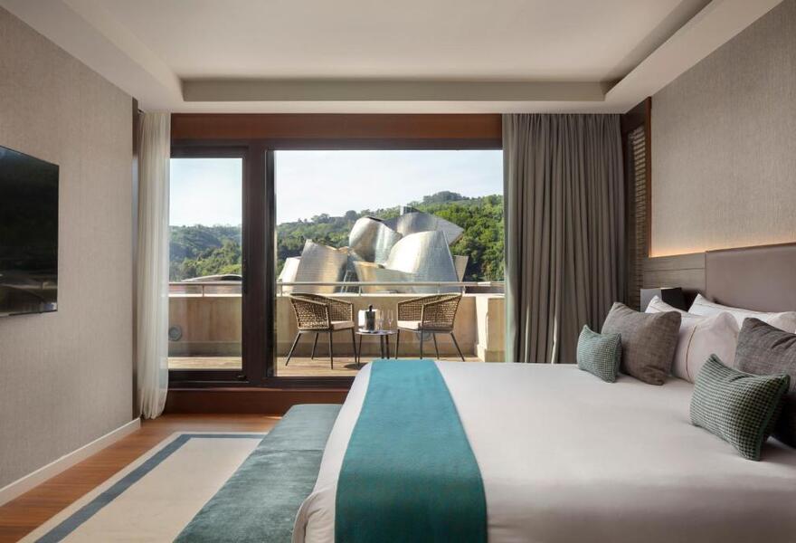 Ein fabelhaftes, modernes Designhotel gegenüber dem Guggenheim und in der Nähe des Flusses. Die eleganten, modernen Zimmer und riesigen Suiten sind mit allem Komfort ausgestattet und bieten eine fantastische Aussicht. Ausgezeichnetes Tapas-Restaurant, Spa, Fitnessstudio und Tagungsräume. Eine sehr stilvolle Wahl.