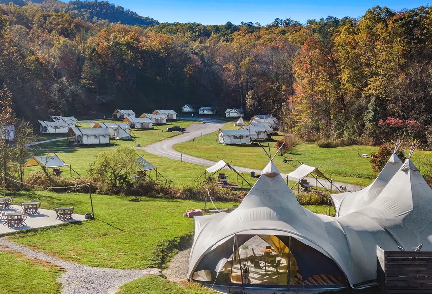 Luxuriöse Zelte in ruhiger und malerischer Lage direkt am Eingang zum Great Smoky Mountains National Park. Die Zelte reichen von luxuriösen Doppelzimmern mit eigenem Bad bis zu Vierbettzelten, die ideal für Gruppen oder Kinder sind. Es wird gesunde und herzhafte Küche serviert, und es gibt Feuerstellen, S'mores und Spiele in Hülle und Fülle.