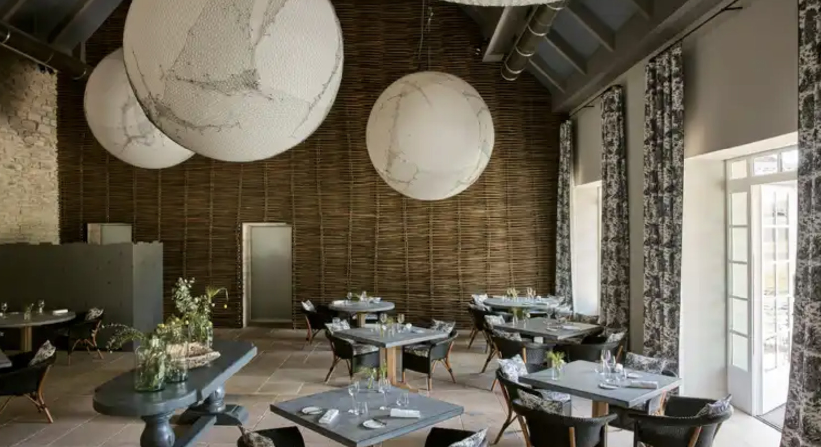 Intimes Restaurant mit hohen Decken und Steinwänden. Der Gourmetkoch Thierry Berger ist herrlich erfinderischSatelliten- / Kabelfernsehen