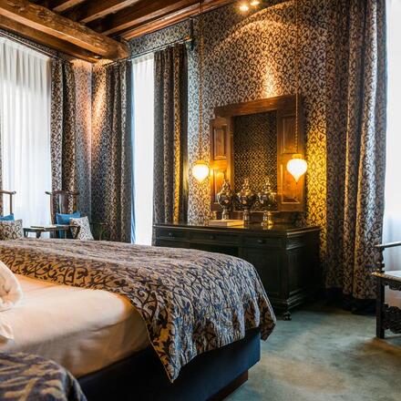 Das Schwesterhotel des Ca Marie Adele, das sich direkt nebenan befindet, bietet nur zwei Zimmer, die beide geschmackvoll und luxuriös eingerichtet sind. Goldfarbene Damasttapeten und passende Jalousien ergänzen die amethystfarbenen Wände und sorgen für ein elegantes Ambiente. Die Duschbäder sind mit Mosaik und Marmor aus der Region gefliest und verfügen über die üblichen kostenlosen Toilettenartikel. Das Palazzetto 113 ist ideal für zwei gemeinsam reisende Paare, da sie ein eigenes Haus mit Wohnzimmer und Dachterrasse sowie alle Vorteile des Hotelservices nebenan genießen können. Das Frühstück kann entweder im Palazzetto oder im Haupthotel serviert werden (im Palazzetto wird nur ein kontinentales Frühstück serviert). Ein stilvoller, intimer Aufenthalt im Herzen der Stadt.