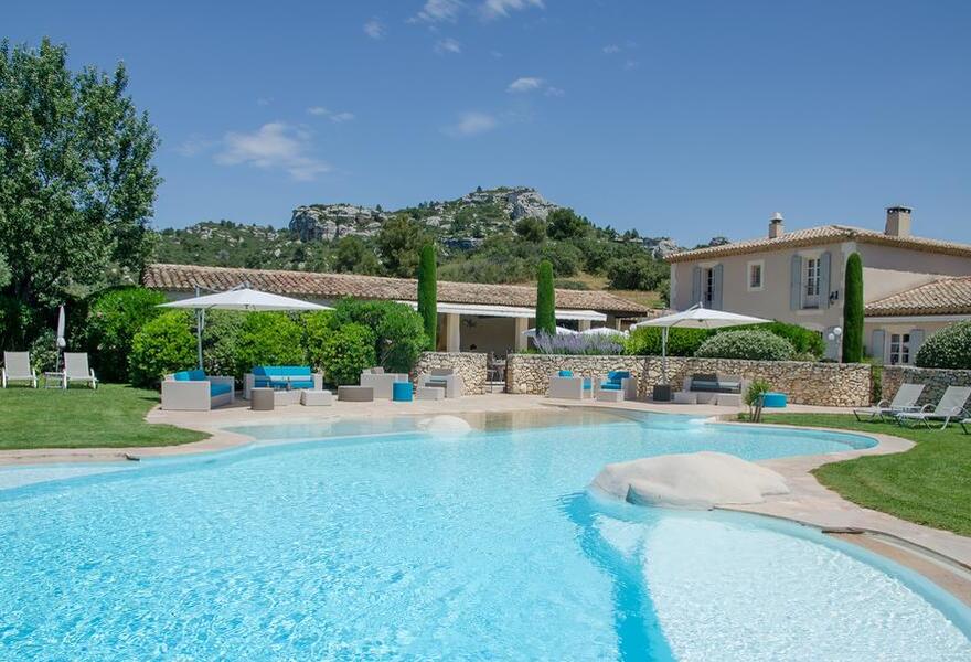 Charmantes 3-Sterne-Hotel mit zwei Schlafzimmern und einem Speisesaal, der aus einem lebenden Felsen gehauen wurde. Alle Zimmer sind in sanften Farbtönen gehalten, jedes hat seinen eigenen Stil. Ein Zwei-Zimmer-Set ist für Familien gedacht. Herrlicher Blick auf die Alpilles und das Tal von Baux. Beheizter Pool, schöne Gärten und Terrasse.