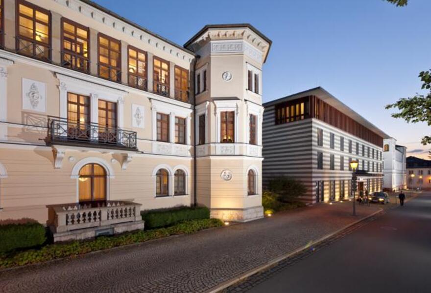 Ein luxuriöses Hotel, das stolz am Weimarer Marktplatz steht. Die großzügig geschnittenen Zimmer und Suiten sind im Stil der 1920er und 30er Jahre gehalten, verfügen aber über alle Annehmlichkeiten, die man erwarten kann. Ein ausgezeichnetes Restaurant und viele Sehenswürdigkeiten der Stadt sind zu Fuß zu erreichen. Ein verwöhnender Aufenthalt.