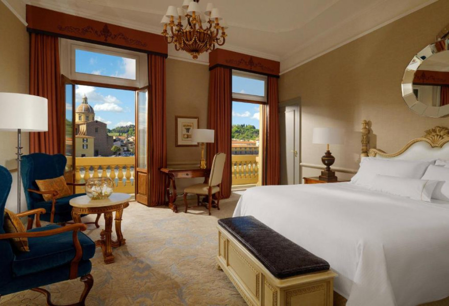 Dieses historische Hotel am Fluss Arno strahlt zeitlose Eleganz aus. Die Innenräume sind im opulenten Renaissance-Stil gehalten und mit Fresken, Kronleuchtern und prächtigen Möbeln ausgestattet. Die Gäste können erstklassige Annehmlichkeiten genießen, darunter ein Restaurant mit gehobener Küche, eine raffinierte Bar und ein luxuriöses Spa.