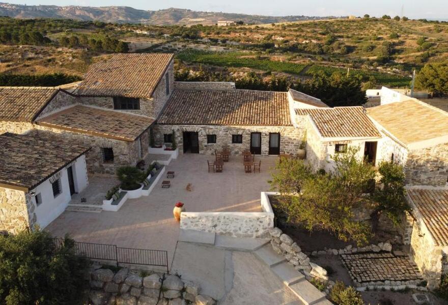 • Baglio Occhipinti is a 19th-century villa near Ragusa, set in its own vineyard and 15 minutes from the beach. Five spacious rooms with stone walls, beams, and tiled floors. Lush gardens, kitchen orchard, pool, and elegant shared spaces complete the charm.