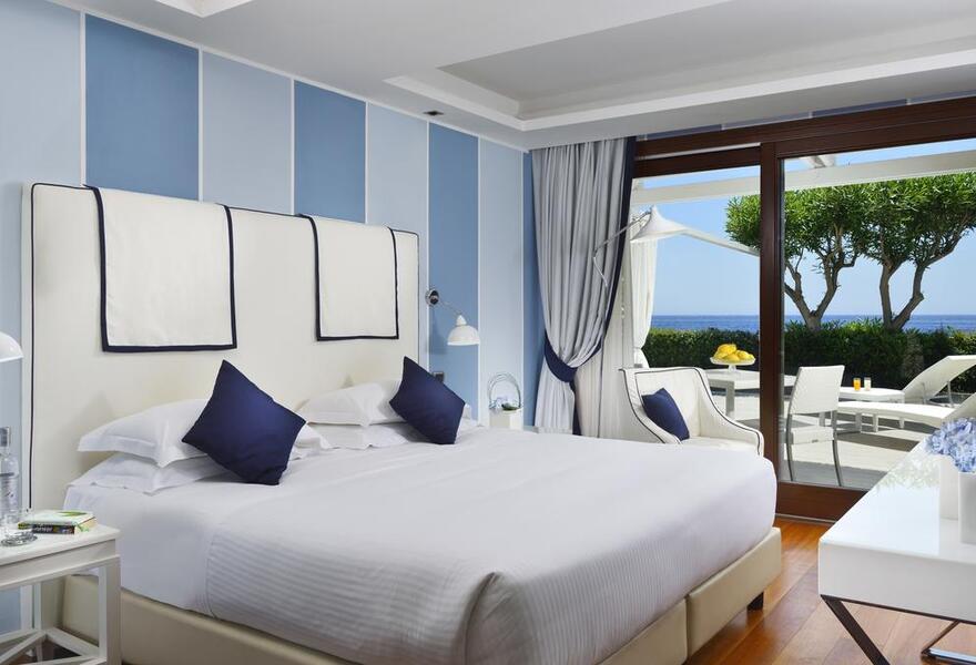Timeless Sicilian elegance and classic luxury. Panoramic views from the romantic terraces, bar, restaurant and private balconies. Rooms and suites in creams with elegant furniture, and some with hot tubs. A perfect spot for a honeymoon, romantic break or wedding.