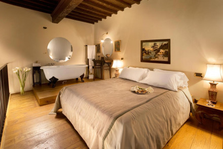 A Five Star luxury villa just outside Florence. Romantic bedrooms and suites, a pampering spa, fantastic food and wine tasting. Guest rooms have four poster beds, fireplaces, mezzanine levels, big bath tubs and a butler service. Stunning views over vineyards below. Ideal for couples or honeymooners.