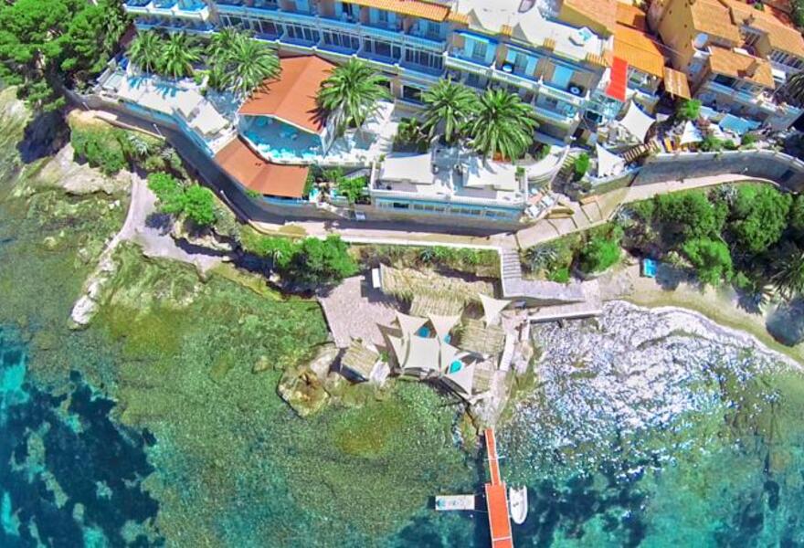 A gorgeous little hotel on a cliff top surrounded by coves with stunning sea views. The traditional building has romantic chic rooms and suites in pastels with private balconies. Excellent fish restaurant, terraces and patios, and lots to explore in the surrounds.