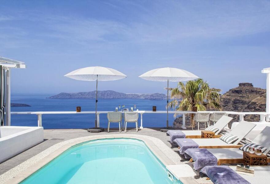 • The Callia Retreat Suites is a chic collection of 17 suites, decorated with contemporary style, in central Thira. Each suite has a private terrace, and the smartest have their own hot tub too. The elegant hotel pool has resort-style day beds, palm trees, and a cool bar. There’s no hotel restaurant, but you’re surrounded by places to eat and drink, and they do a lavish breakfast, and a snack menu in the bar. Adults only.
