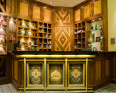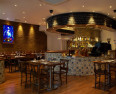 "A serene, churchy theme defines the dining-room, where restored pews and prayer chairs do for seating, and back-lit stained-glass tableaux hang on bare brick walls."
