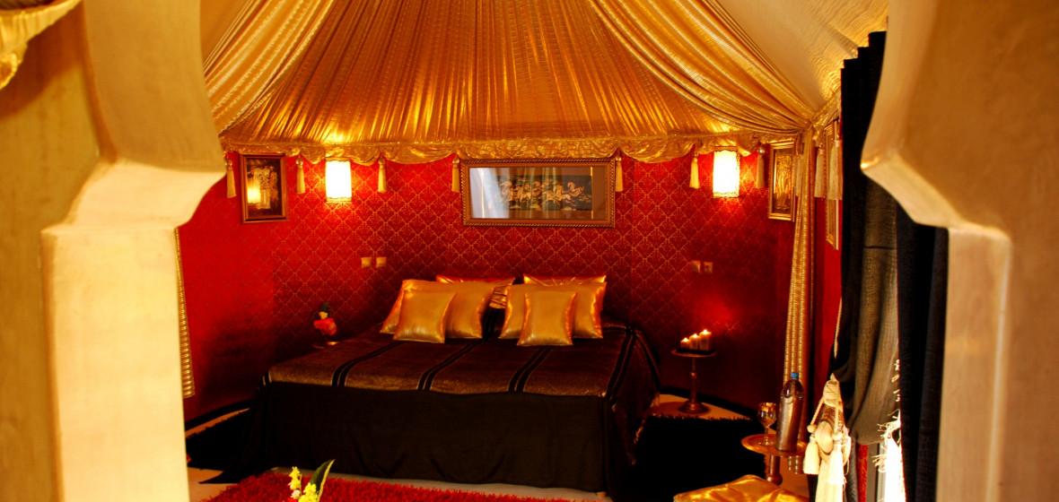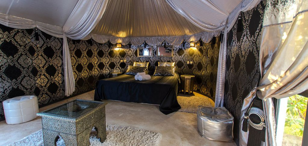 Les propriétaires français, Patrick et Ghislaine, ont créé une oasis de calme composée de 15 tentes caïdales (imaginez de petits chapiteaux) disposées autour d'une vaste piscine à débordement, au cœur de jardins parfumés, encerclés par les montagnes. Chaque tente est équipée de la climatisation, d'un salon, d'un dressing et d'une salle de bains en tadelakt. Il existe également une tente hammam privée. La chef Fatima prépare de délicieux plats locaux, servis sous des auvents au bord de la piscine ou dans le charmant restaurant.