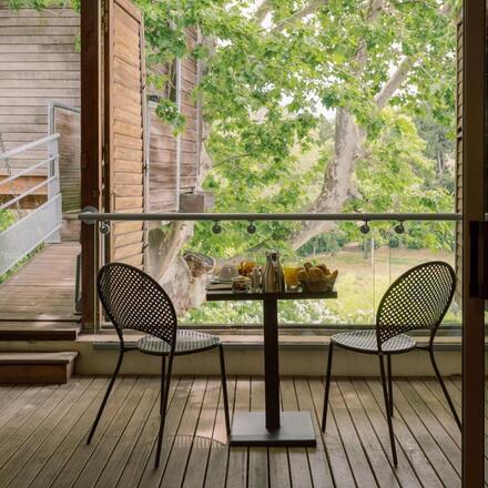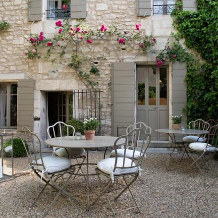 Where better to base oneself for visiting the delights of the Golden Triangle of Avignon, Arles and Aix en Provence, plus a little further afield Nimes, Aigues-Mortes and the Camargue than Le Mas des Carassins. It is a charming provencal farmhouse in the peaceful outskirts of Saint Remy, surrounded by a glorious garden filled with ancient olive trees, lavender, rosemary and thyme bushes and interesting sculpture from near and far plus two good sized swimming pools, one for relaxing and the other quieter and more suitable for the energetic lap swimmer. In the warmer months, sit out and enjoy a refreshing glass of rosé in the garden. In fact, don’t move and have dinner here too, listening to the gentle vibrating of the cicadas wings. The Restaurant d'Yvan offers an à la carte or a prix fixe discovery menu of the day, using the freshest local ingredients. In the cooler months dinner is in the restaurant surrounded by paintings from local artists. Recently renovated bedrooms are comfortable but not luxurious, which really sums up the hotel and is reflected in the price; great value and great location.