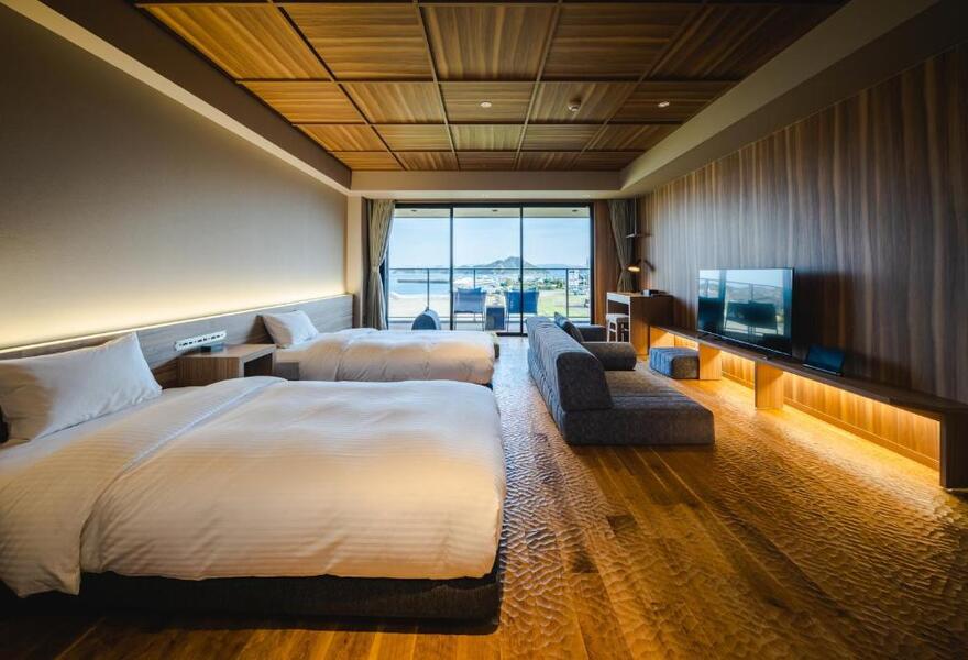 A modern hotel at Uno Port in Tamano. Guest rooms are warm and stylish while bright communal areas pop in shades of seaside blue. There's a restaurant serving French cuisine, plus a shared kitchen. With a terrace overlooking the ocean, choose to chill, or head further afield for some island hopping.