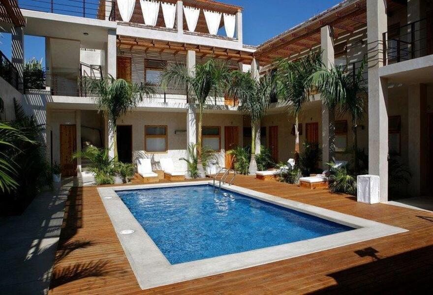 A peaceful boutique hotel in the heart of Tulum, offering a tranquil base for exploring. The interiors blend modern design with Mexican and Mayan influences, creating a bohemian yet sophisticated atmosphere. Enjoy two pools, a rooftop bar, regional dining, and yoga on the terrace. An ideal escape.