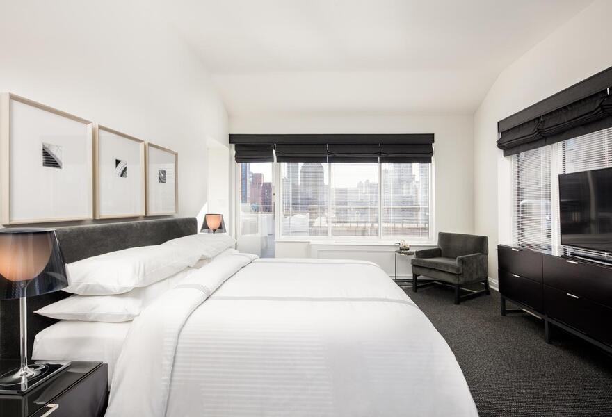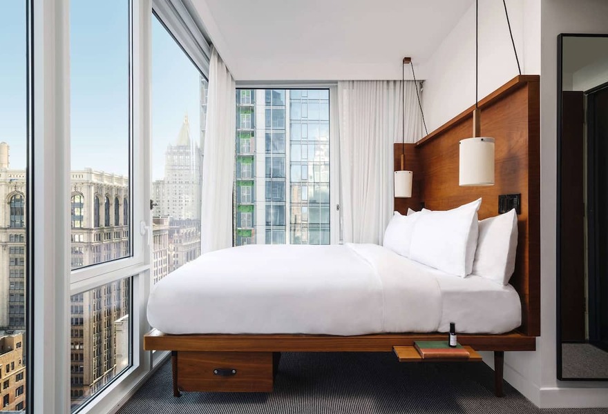 Midtown Manhattan hotel with impressive views of iconic landmarks. Modern, minimalist rooms give a sophisticated vibe with their industrial chic interiors, exposed concrete ceilings and bespoke artwork. Choice of restaurants and bars offer hidden courtyard and rooftop cocktails. Sleek city style.