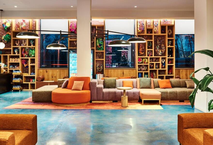 Cool & contemporary neighbourhood property with up-and-coming Brooklyn location. The vast lobby living area - complete with a happening bar & cafe - is the heart of the hotel. Decor effortlessly blends midcentury NYC, industrial grit & 1970s colour palette. Perfect for on-trend New York aficionados.