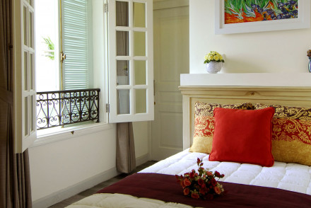 Smarana Hanoi Heritage is based around a colourful collection of Hang Trong folk paintings. Whimsical rooms are inspired by the seasons, with upholstered headboards and patterned wallpapers. The gourmet French eatery and rooftop bar complete the unique boutique experience.